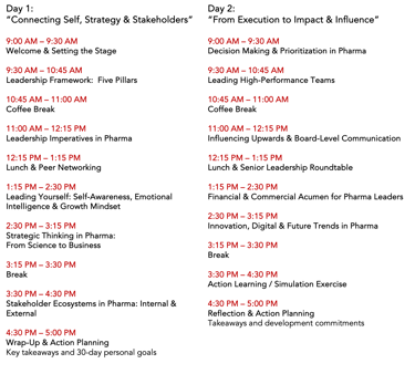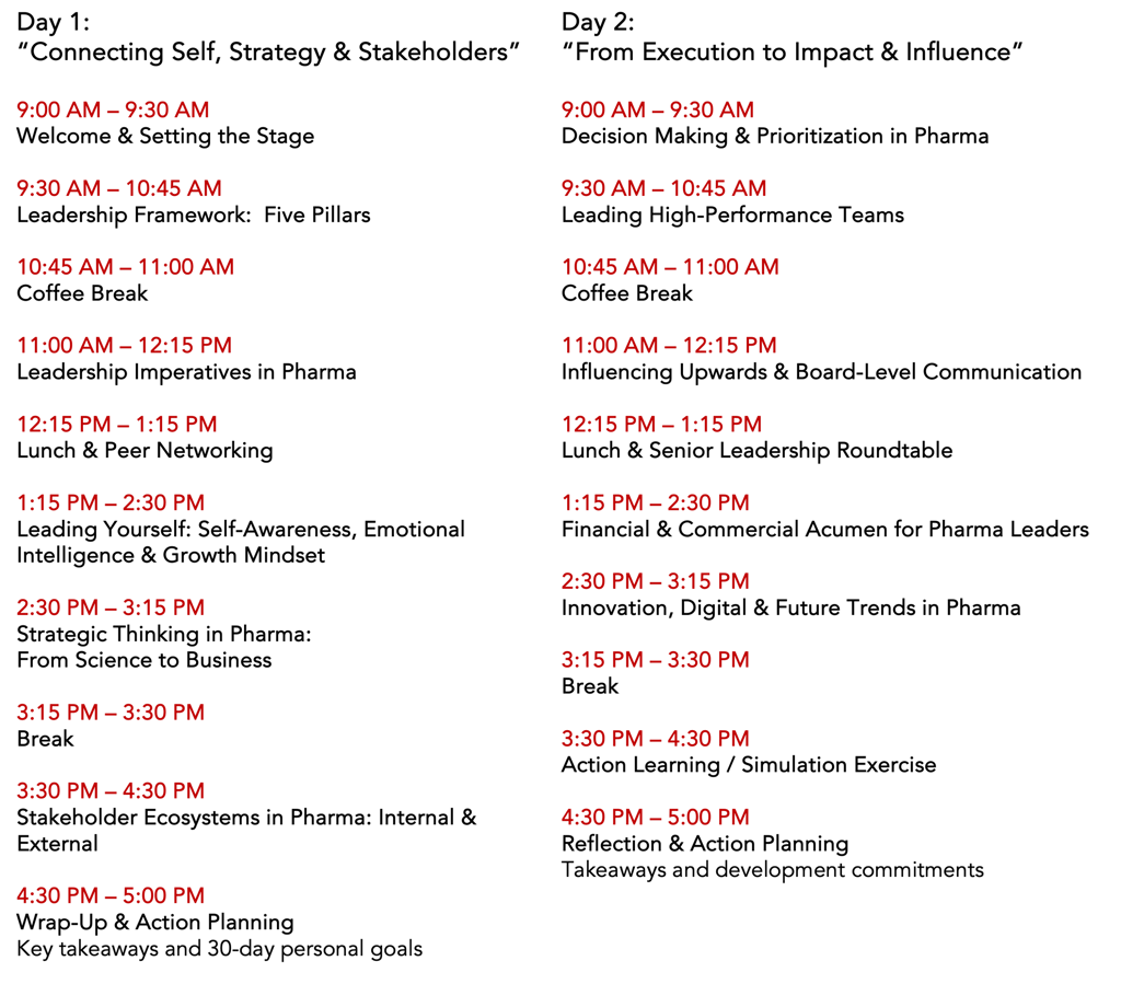 The BioPharma Leaders Accelerator Academy is a two-day training, designed to equip high-potential Canadian pharmaceutical professionals with the leadership mindset, strategic skills, and cross-functional fluency needed to excel and prepare for senior executive roles (e.g. Director, VP, Business Unit Head, General Manager).